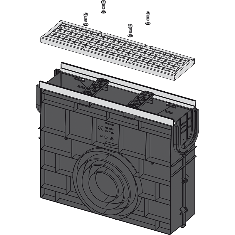 - Verzinkter Gitterrost – befestigt in der Rinne mit vier rostfreien Schrauben, Maschengröße 12x18 mm