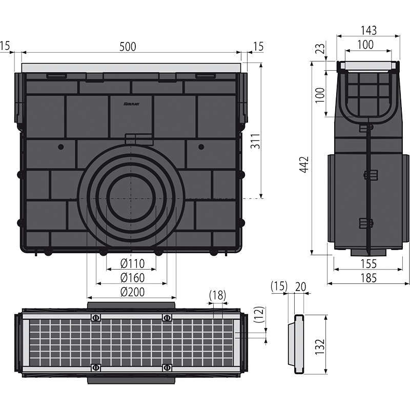 - Seitlicher Anschluss an Ablauf Ø110, 160, 200 mm