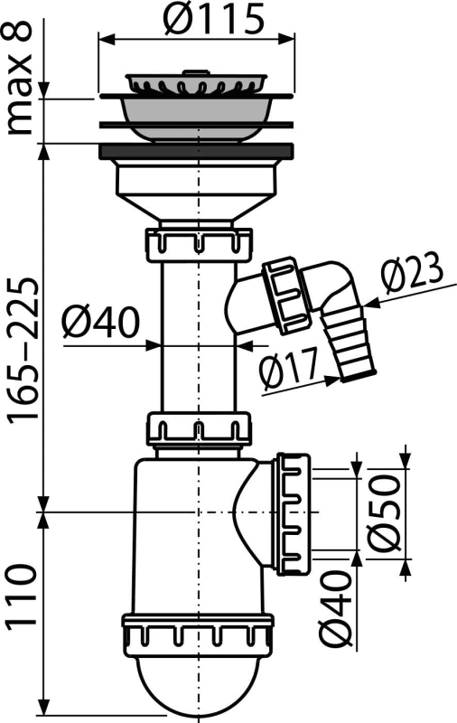 Spülbeckensiphon mit einem Edelstahlgitter DN115 und einem Geräteanschluss