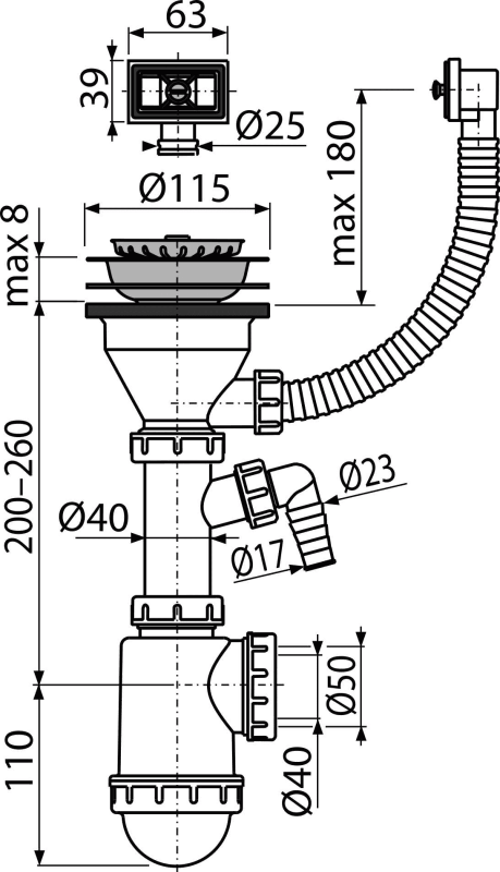 - Siphon-Körper mit Geräteanschluss und Überlauf