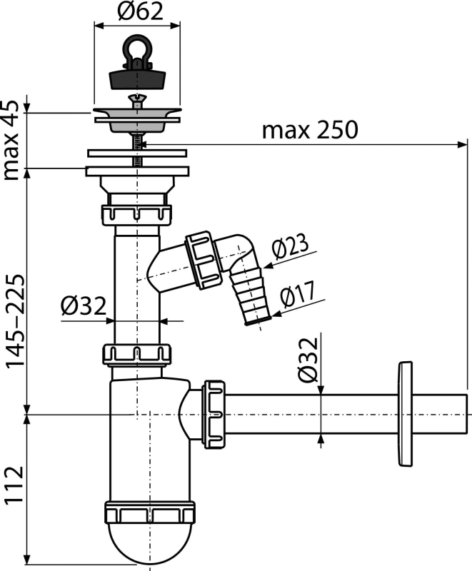 Flaschengeruchverschluss für die Waschbecken DN32 mit einem Geräteanschluss und einem Edelstahlgitter DN63