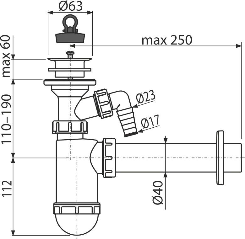Flaschengeruchverschluss für die Waschbecken DN40 mit einem Geräteanschluss und Kunststoffgitter DN63