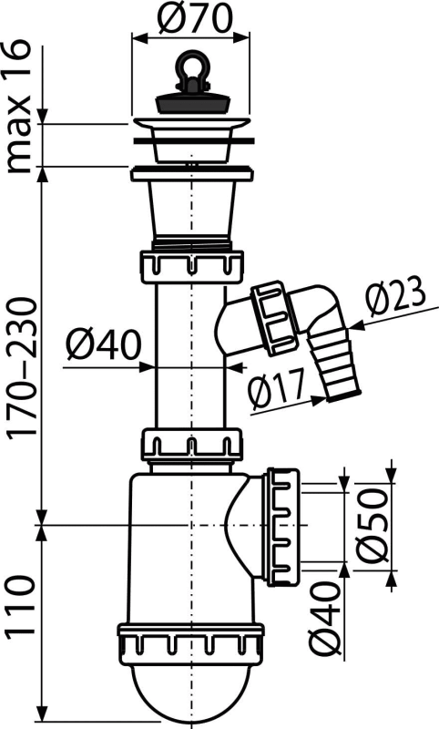 Spülbeckensiphon mit einem Kunststoffgitter DN70 und einem Geräteanschluss