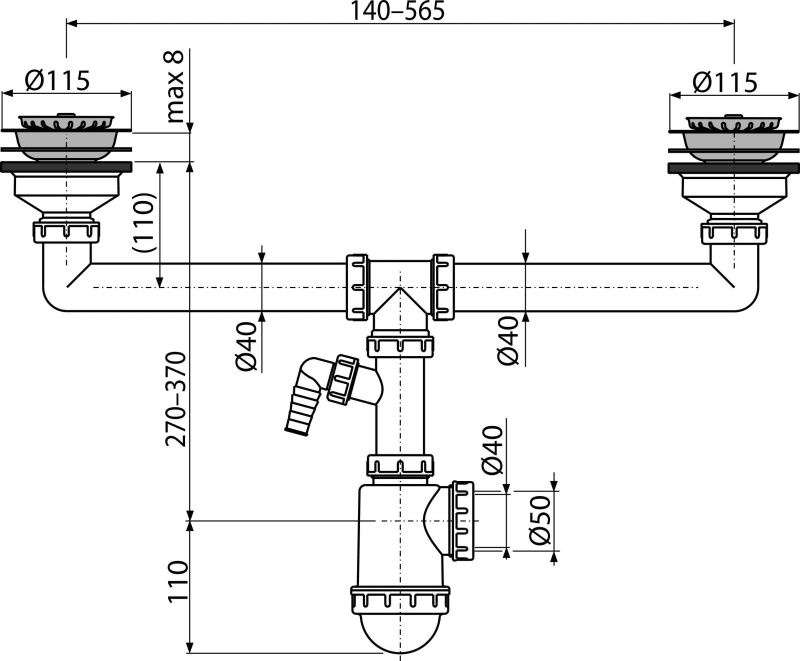 Doppelspülbeckensiphon mit einem Edelstahlgitter DN115 und einem Geräteanschluss
