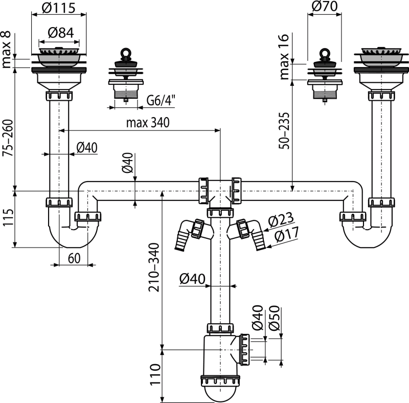 - Siphonkörper mit zwei Geräteanschlüssen
