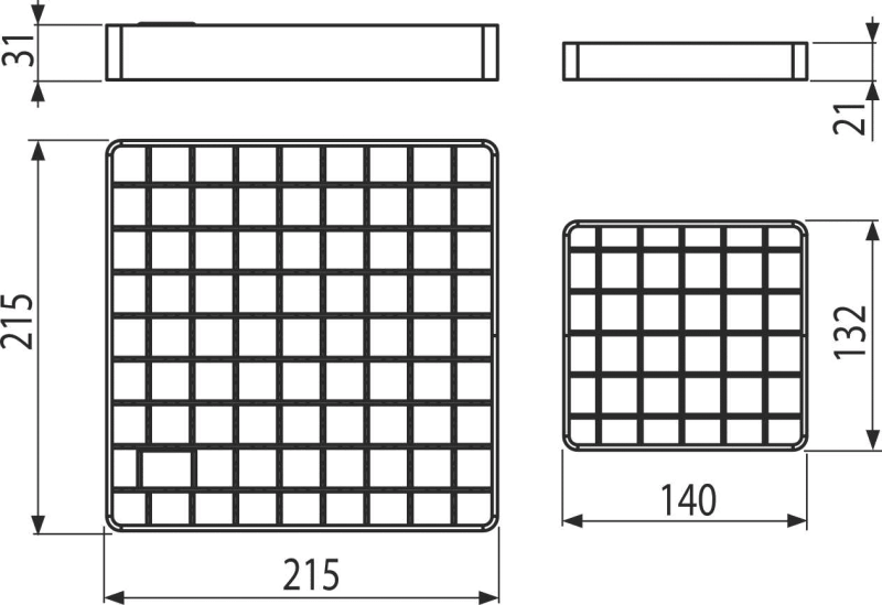 - Rostabmessungen 215 × 215 mm, 132 × 140 mm