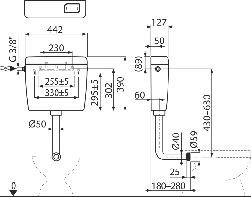 • Spülgarnitur für niedrig liegenden Spülkasten (Betätigungsplatte)